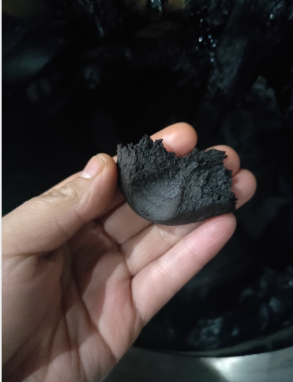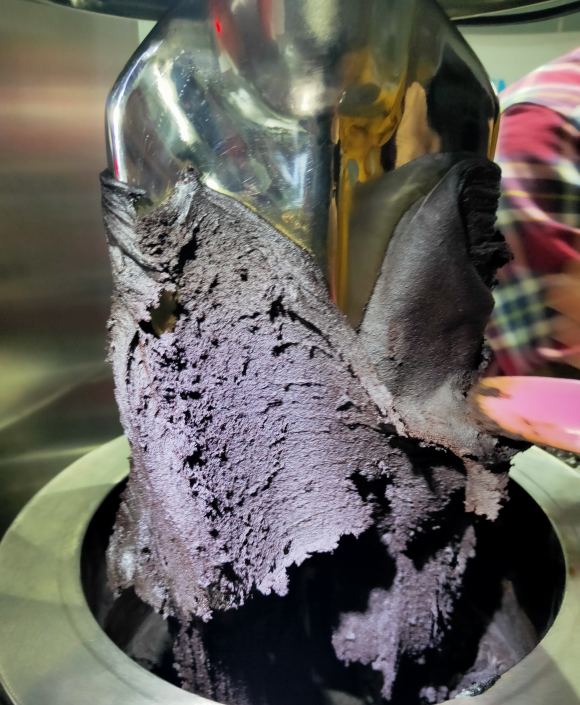 物料呈高粘度的膏體狀,第一代就是靠人工棒打,截至目前更新代換也是先用密煉機攪拌,攪拌之后在用壓面機來回碾壓。立式捏合機的捏合功能剛好代替兩種,經(jīng)過捏合實驗,客戶成型的產(chǎn)品效果相當好。如此粘度之高的物料,擠壓出料干凈幾乎無殘留讓客戶甚是滿意,生產(chǎn)直接提高60%效率。